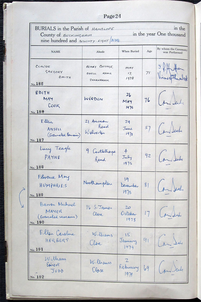 Below is a transcription and image of page 24 of the Burials 1963 onwards of St James The Great, Hanslope