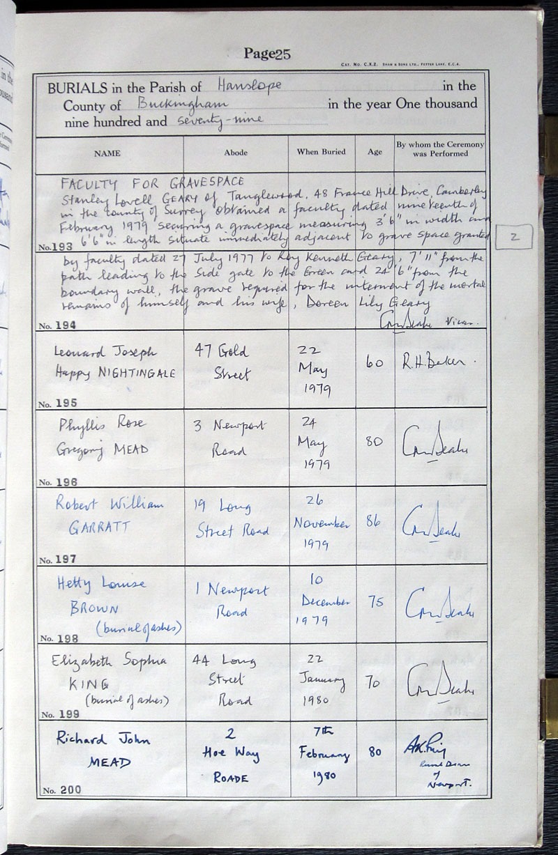Stanley Lovell Geary of Tanglewood, 48 France Hill Drive, Camberley, in the county of Surrey obtained a faculty dated nineteenth of February 1979 securing a gravespace measuring 3' 6" in width and 6' 6" in length situate immediately adjacent to grave space granted by faculty dated 27 July 1977 to Roy Kenneth Geary, 7' 11" from the path leading to the side gate to the Green and 24' 6" from the boundary wall, the grave required for the internment of the mortal remains of himself and his wife, Doreen Lily Geary. |