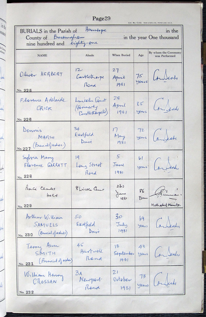 Below is a transcription and image of page 29 of the Burials 1963 onwards of St James The Great, Hanslope |