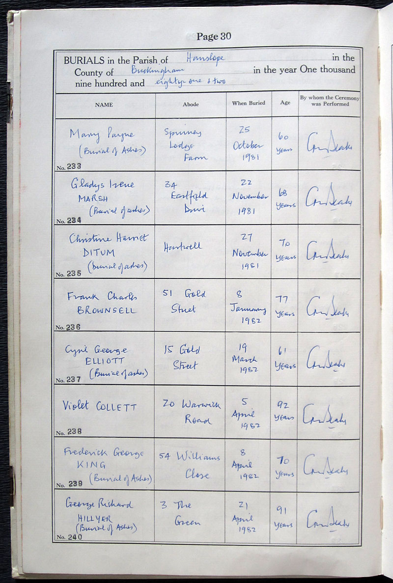 Below is a transcription and image of page 30 of the Burials 1963 onwards of St James The Great, Hanslope |
