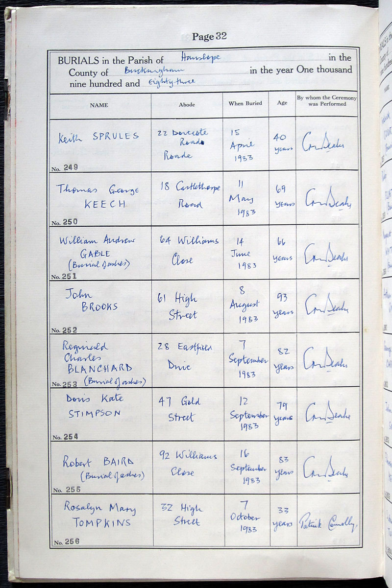Below is a transcription and image of page 32 of the Burials 1963 onwards of St James The Great, Hanslope |