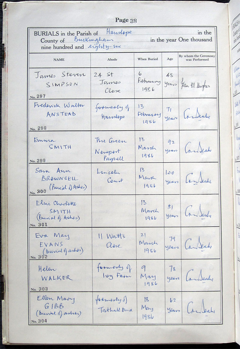 Below is a transcription and image of page 38 of the Burials 1963 onwards of St James The Great, Hanslope