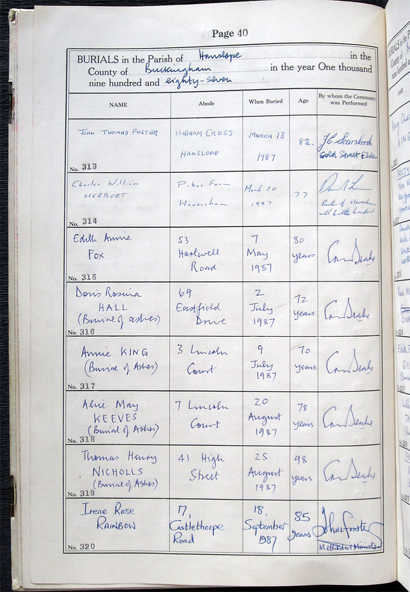 Below is a transcription and image of page 40 of the Burials 1963 onwards of St James The Great, Hanslope