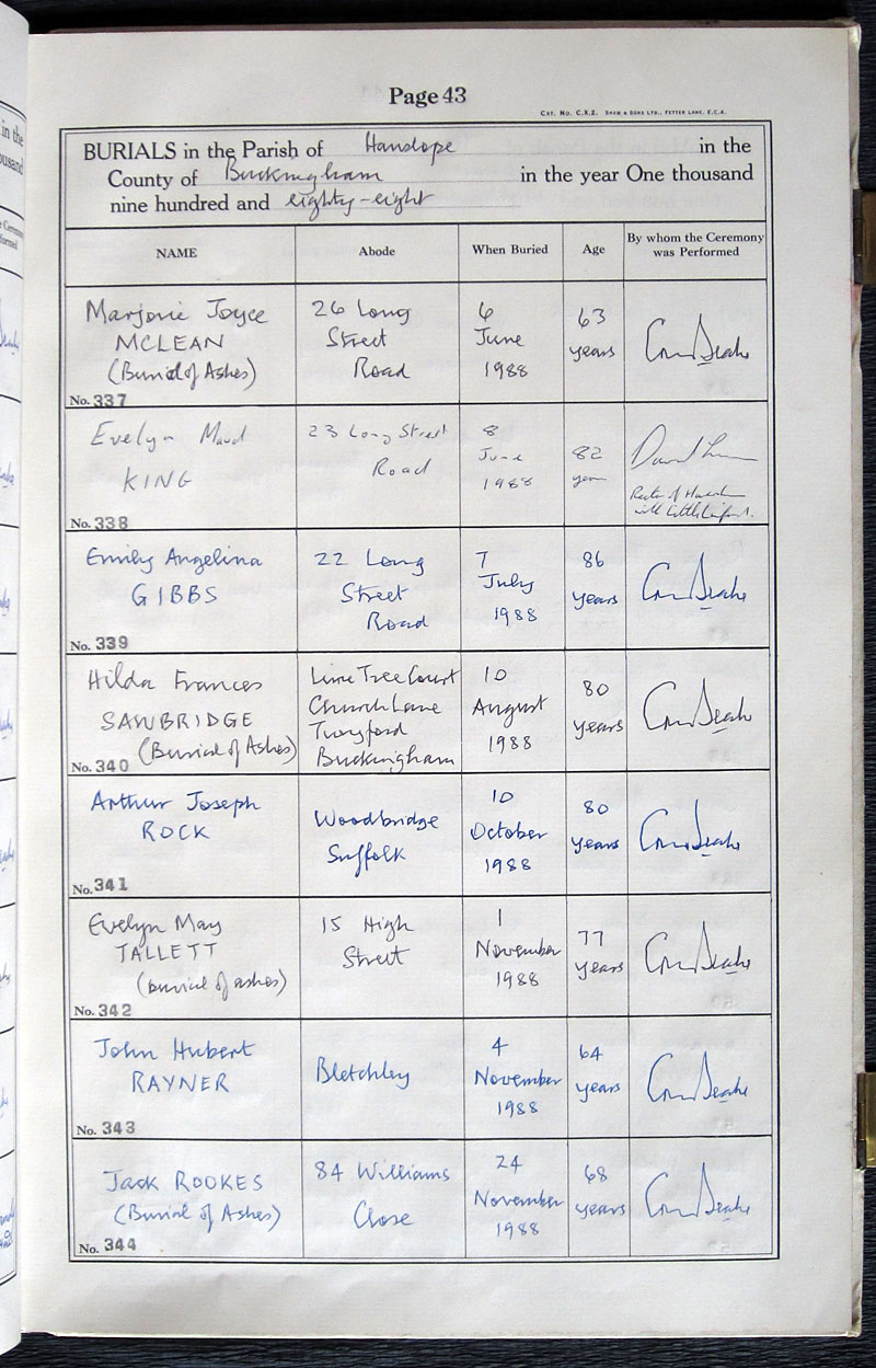 Comments in register: Burial of ashes |