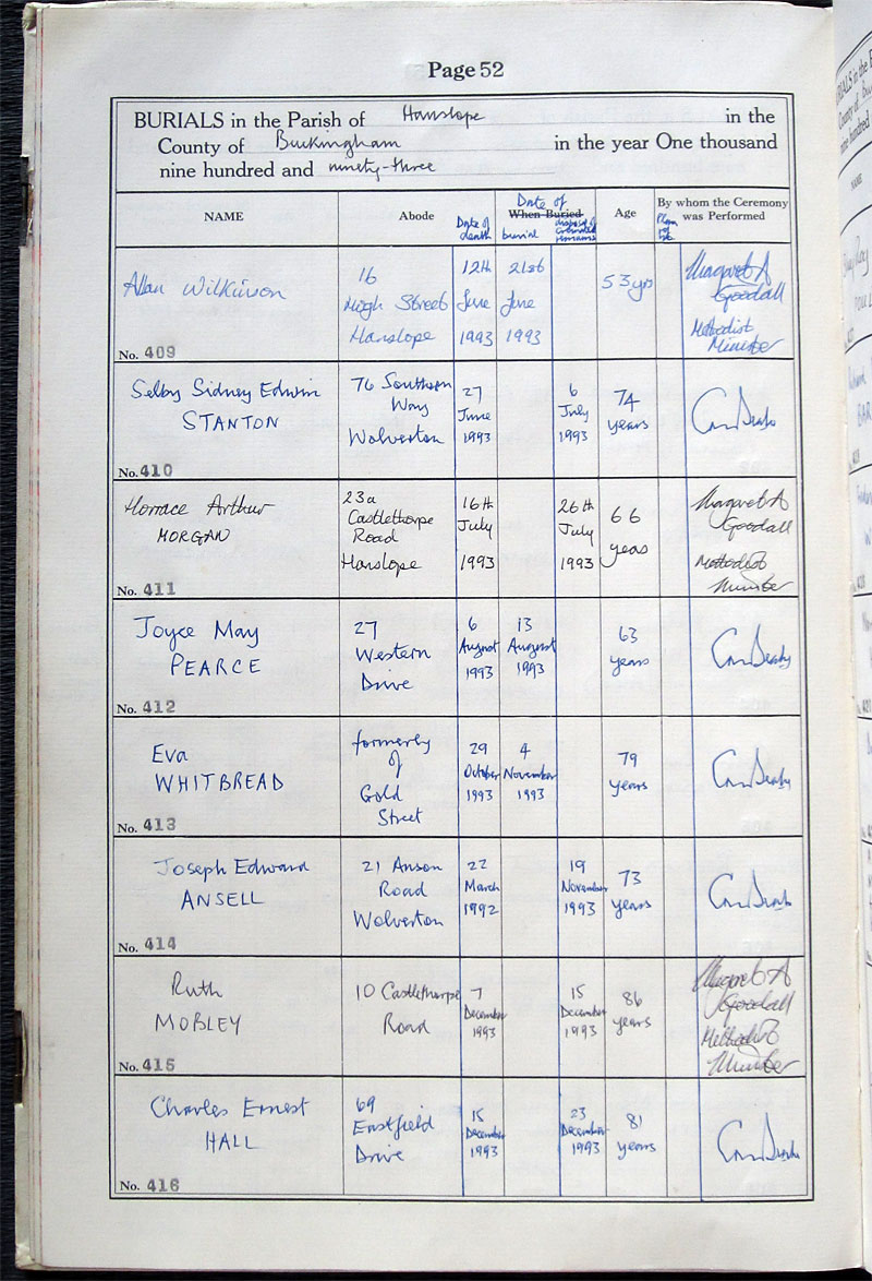 Comments in register: Date of Death: 15th December 1993, burial of ashes. |