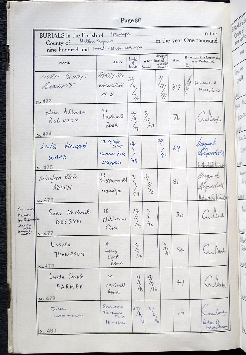 Comments in register: Date of 6 May 1998. Burial of ashes.