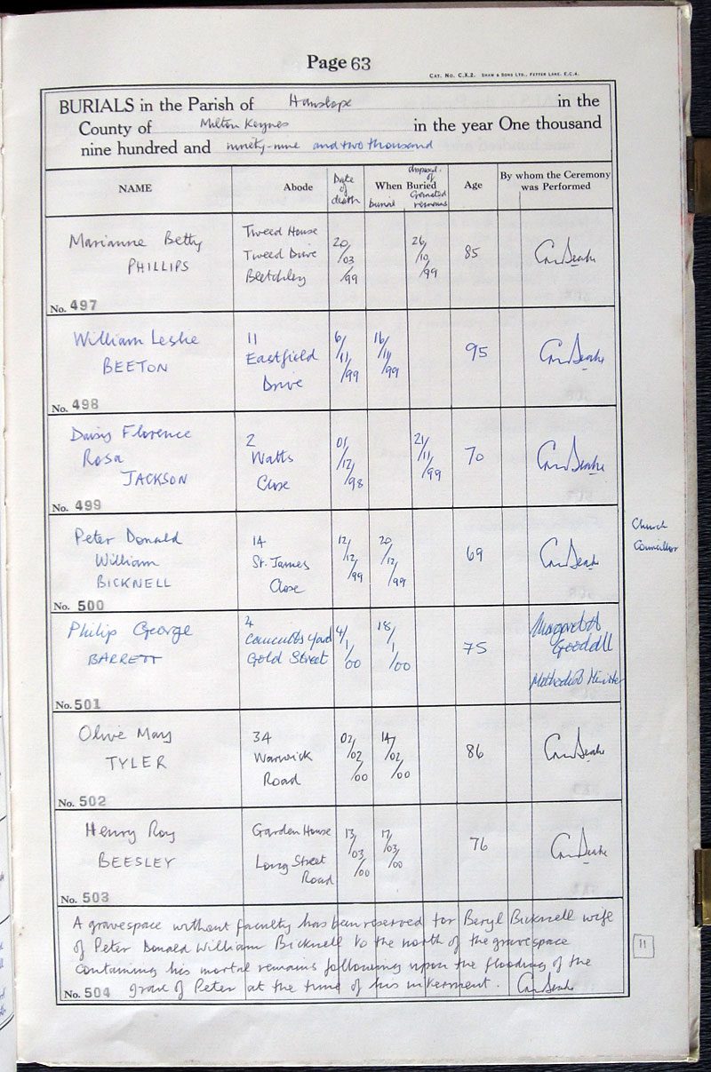 Comments in register: A gravespace without faculty has been reserved for Beryl Bicknell wife of Peter Donald William Bicknell to the north of the gravespace containing his mortal remains following upon the flooding of the grave of Peter at the time of his internment. |