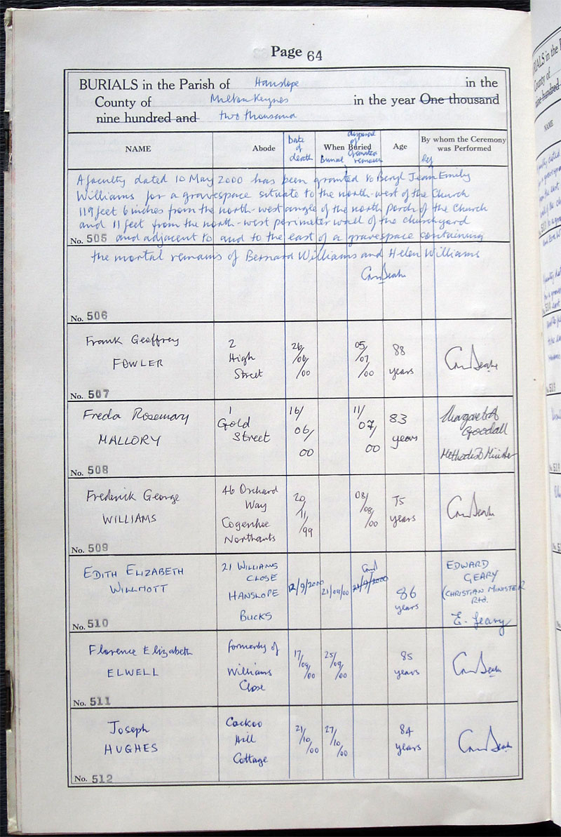 Comments in register: A faculty dated 10 May 2000 has been granted to Beryl Jean Emily Williams for a gravespace situate to the north west of the Church 119 feet 6 inches from the north-west angle of the north porch of the church and 11 feet from the north-west perimeter wall of the churchyard and adjacent to and to the east of a gravespace containing the mortal remains of Bernard Williams and Helen Williams.