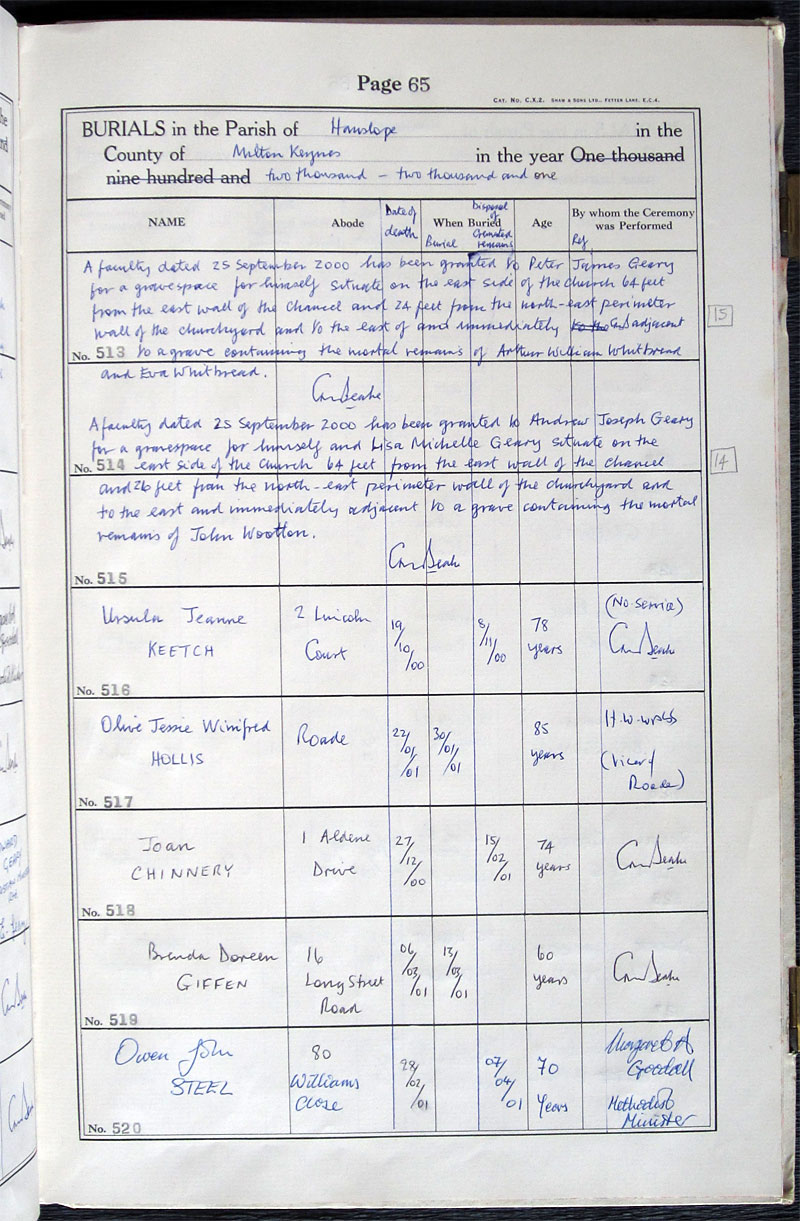 Comments in register: A faculty dated 25 September 2000 has been granted to Peter James Geary for a gravespace for himself situate to the east side of the church 64 feet from the east wall of the Chancel and 24 feet from the northeast perimeter wall of the churchyard and to the east of and immediately adjacent to a grave containing the mortal remains of Arthur William Whitbread and Eva Whitbread. |