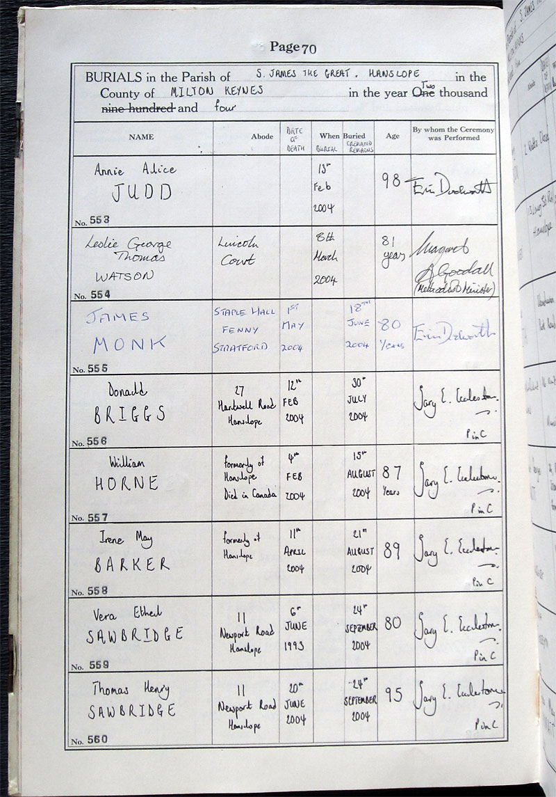 Transcriber's note: Date of death not recorded. Abode not recorded formerly Williams Close, Hanslope.