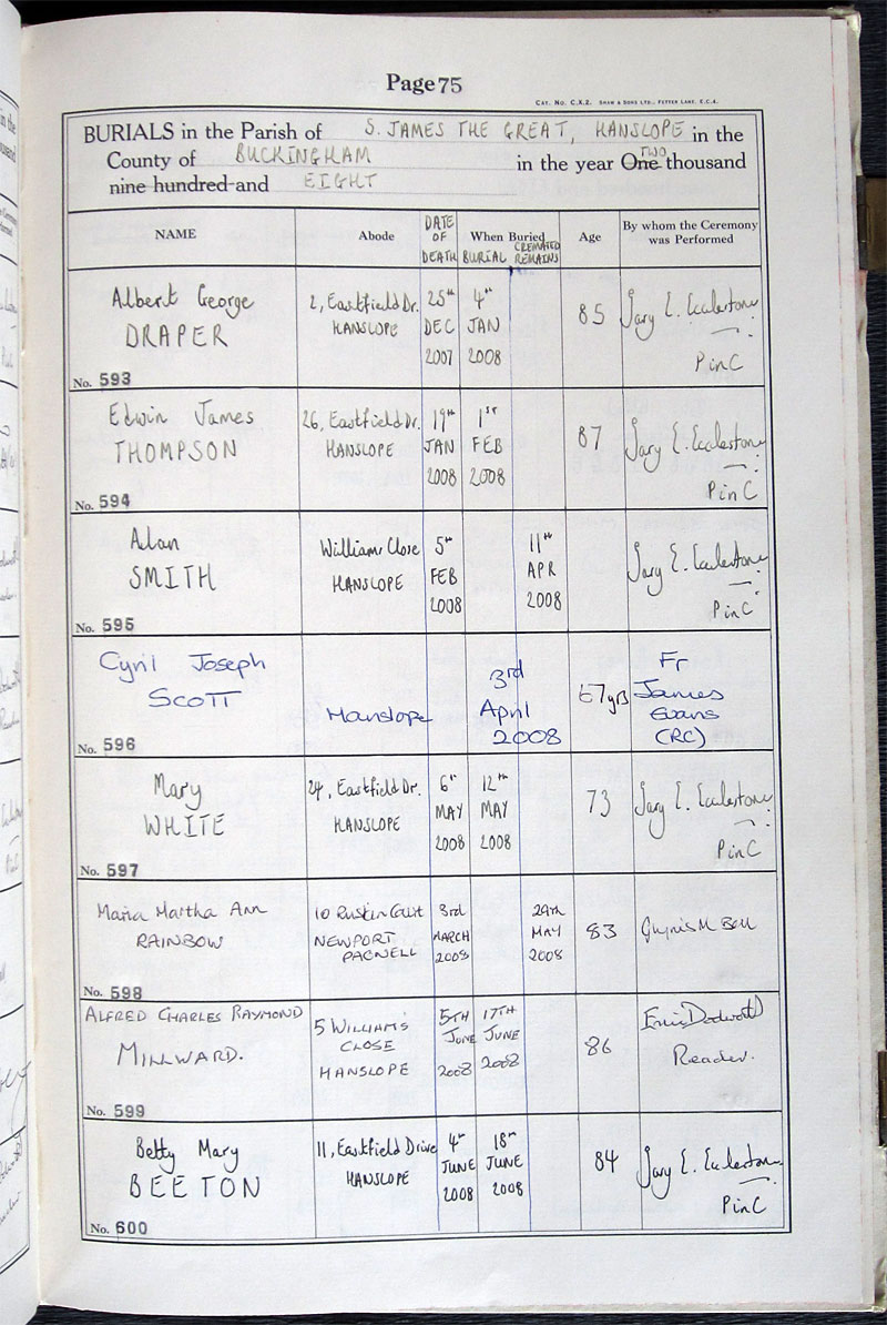Comments in register: Date of death 5 February 2008. Burial of ashes. |