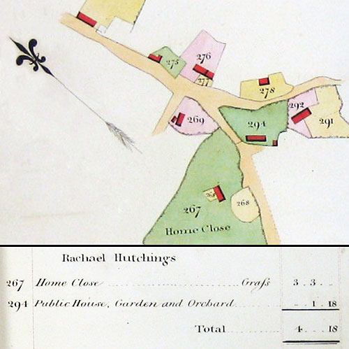 The top half of this image is part of a map of Tathall End in 1818 taken from a survey of the properties owned by Edward Watts. The lower half shows that plot 294 was a public house occupied by Rachael Hutchings.