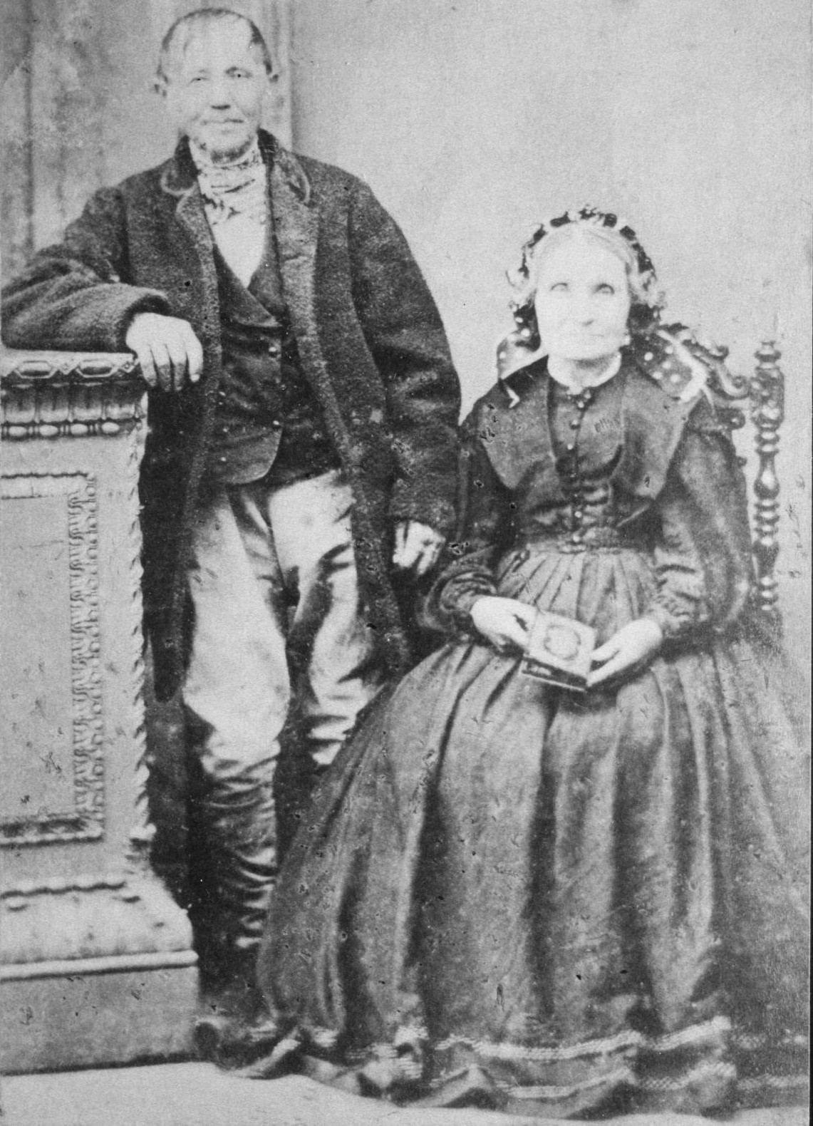 In the photo he is wearing moleskin knee breeches and a stock round his neck. That kind of folded tie or stock was out of fashion by the 1830s but lingered on in the country side. Her bonnet dates to the 1850s, when small muslin or lace caps were worn indoors. A larger 'poke bonnet' would have been worn over the top for outdoor wear. Ruth's dress dates from about 1860 so this photo was probably taken around the late 1860s.