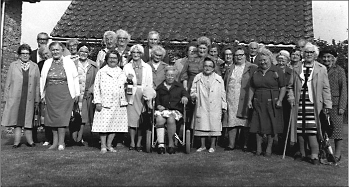 | L-R May Gobey, Les Collins, Mrs Collins, Hilda Sawbridge, Mrs McTavish, Mrs Baird, Mrs Ismay Keeves, Mrs Crick, Marge Garrett, Blanch Evans, Frank Brownsell, Edie Brownsell, Mrs Keeves, Mrs Kettle, Margaret Walker, Lottie Hawkes, Elsie Smith, Mrs Eva Evans, Mrs Pettifer, Mr Float, ____, ____, Mrs Simons, Mr Simons, Mrs Jones, Millie Haver ( Aunt Mil) | |||||