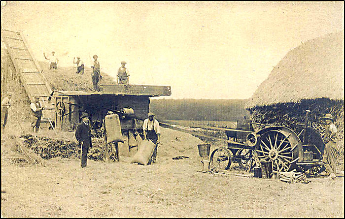 | Threshing scenes in the rick yard of Forest Farm while Tom Courtman had it in the 1920's and 1930's - Salcey Forest in the background | |||||