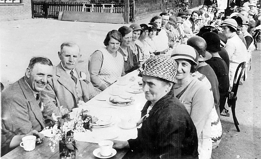 A party in the High Street, at this end of the table are seated,Dick Eakins, Mr Tebby, May Frost, Elsy Walker, Edith Price, Mrs H Hartrop, and Mrs Mead.