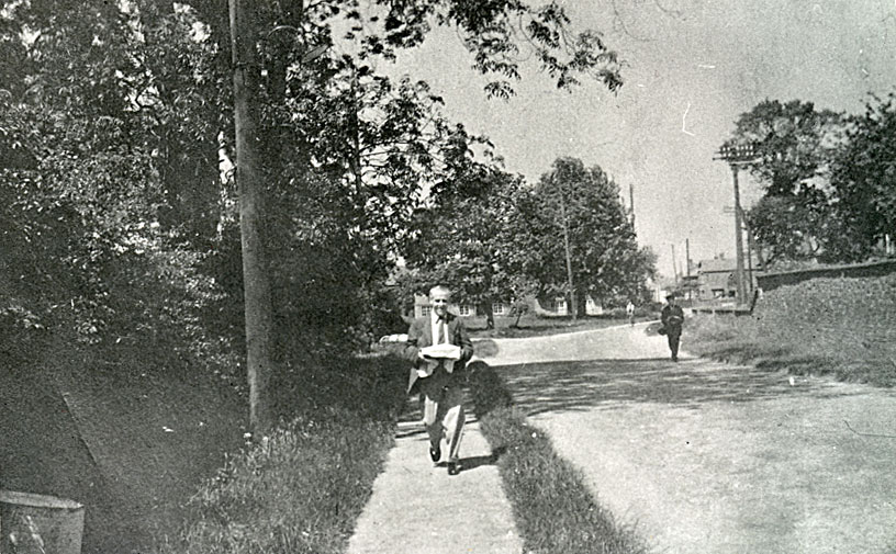 | Fred Palett on his way home from the Bakehouse with his Sunday dinner, just passing the Horse Pond. | |||||