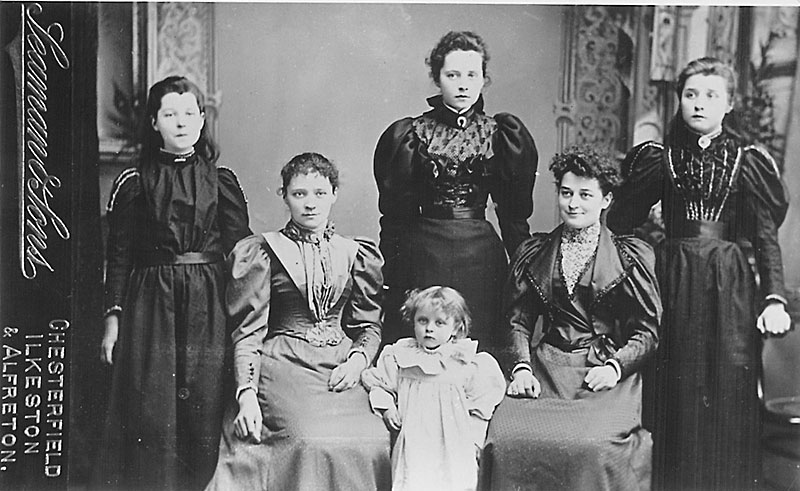| Left to right: Miss Jenny Hillyer, Mrs Elizabeth Hillyer, child Lucy Hillyer daughter of Elizabeth, Miss Selena Hillyer (Mrs Alf Sawbridge), Miss Annie Hillyer (Mrs Walter Wadsworth) & Miss Alice Hillyer (Mrs Harry Robins). | |||||