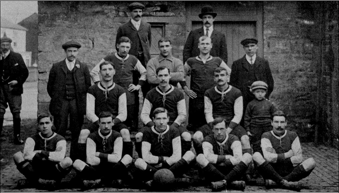 | Hanslope St James A F C Buckinghamshire League, Division 2 Champions 1906-7 & 1907-8. Starting left to right top row A. Ditum, H. Neal. Next row A. Sawbridge, T. Herbert, H. Brownsell, O. Mills, G. Horn, Next Row J. Kerridge, A. Olney, W. Stimson, Master F. Elkington, Bottom row W. Woodland, T. Chilton, F. Kerridge, H. Simons & A. Gileen. | |||||
