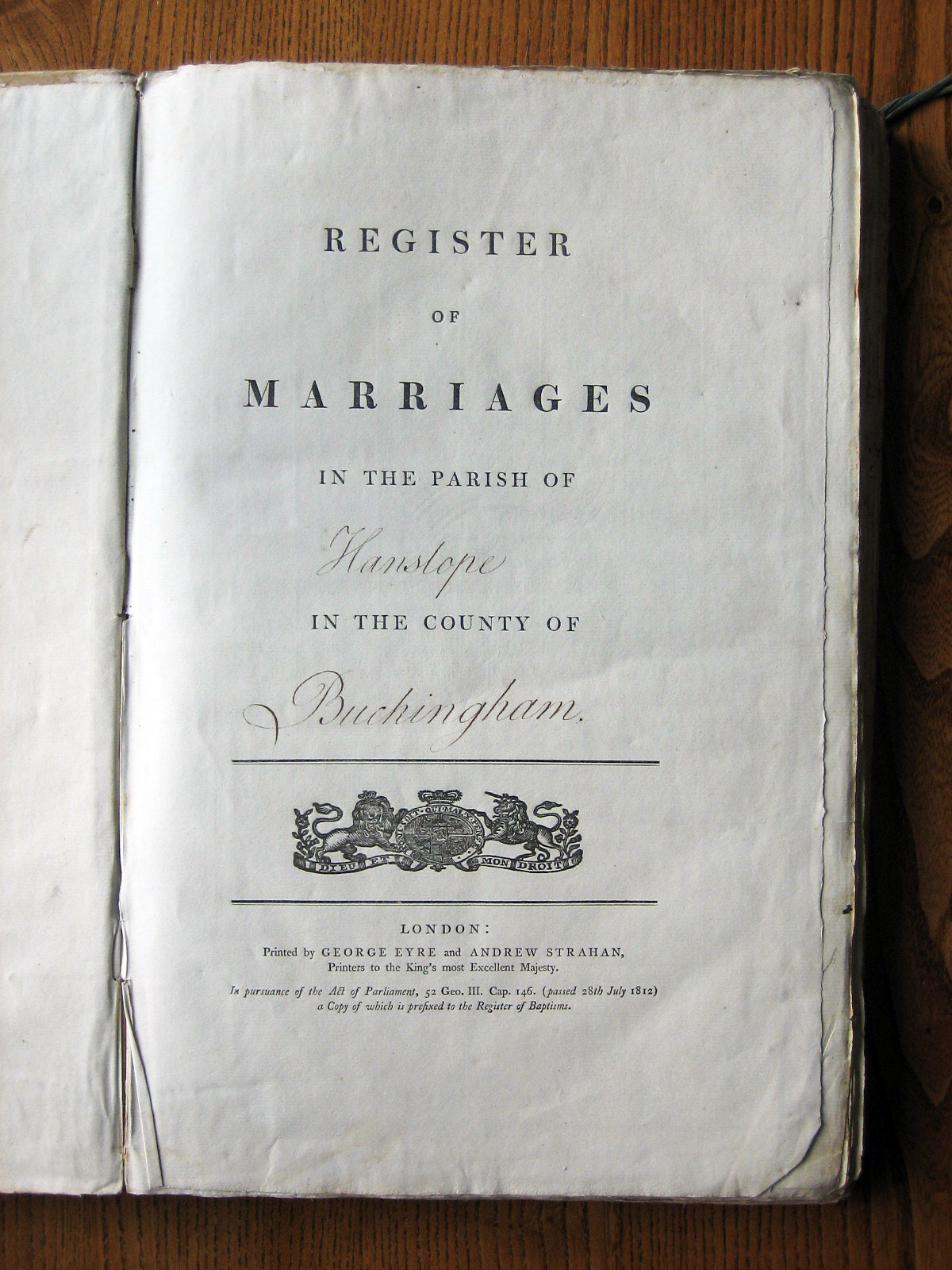 Below is a transcription and image of cover pages of the Marriage register for 1813-1837 of St. James The Great, Hanslope |