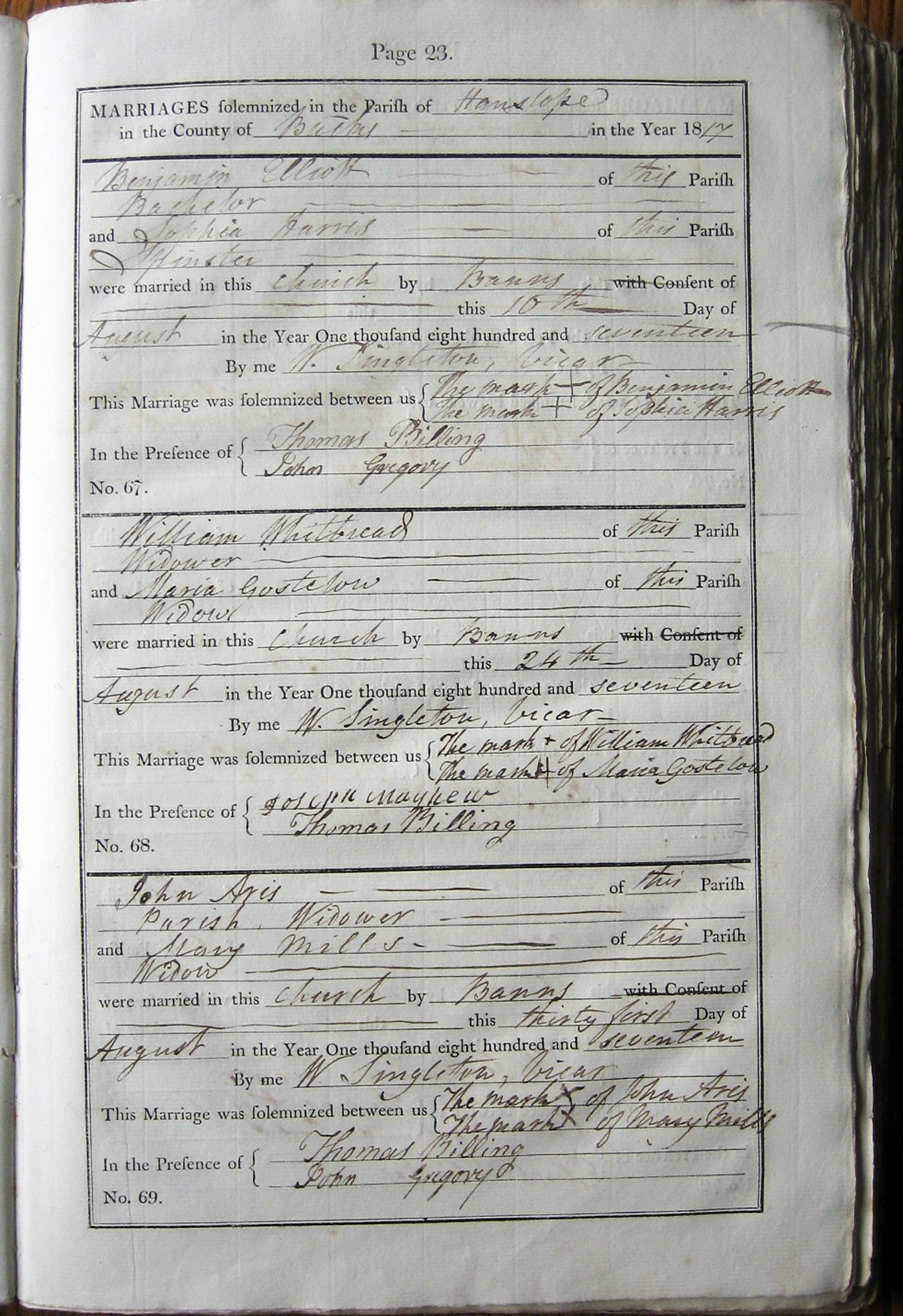 This marriage was solemnized between us signed with mark of Benjamin Elliott