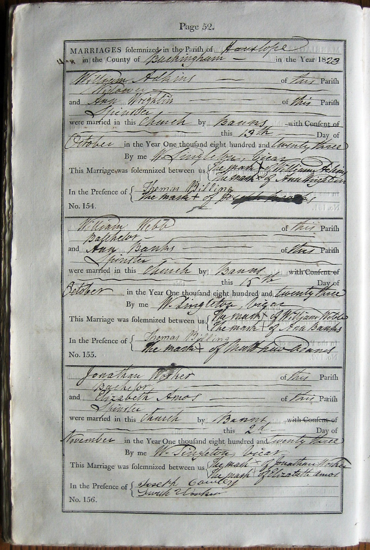 This marriage was solemnized between us signed with mark of Jonathan Worker