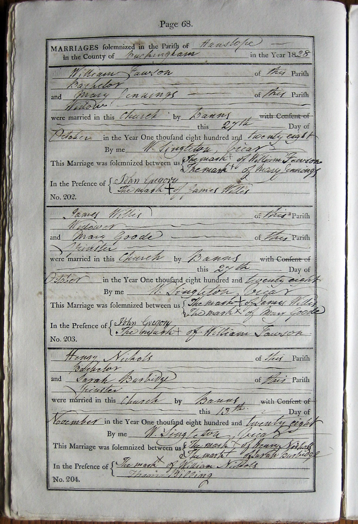 This marriage was solemnized between us signed with mark of Henry Nichols
