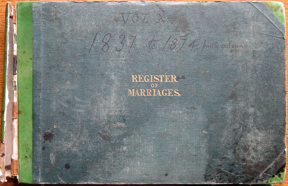 Below is a transcription and image of cover pages of the Marriage register for 1837-1874 of St. James The Great, Hanslope |