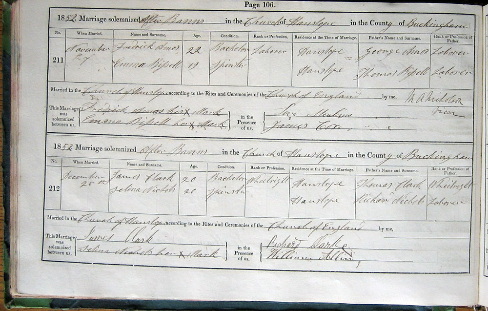 Married in Church of Hanslope according to the Rites and Ceremonies of the Church of England by me,