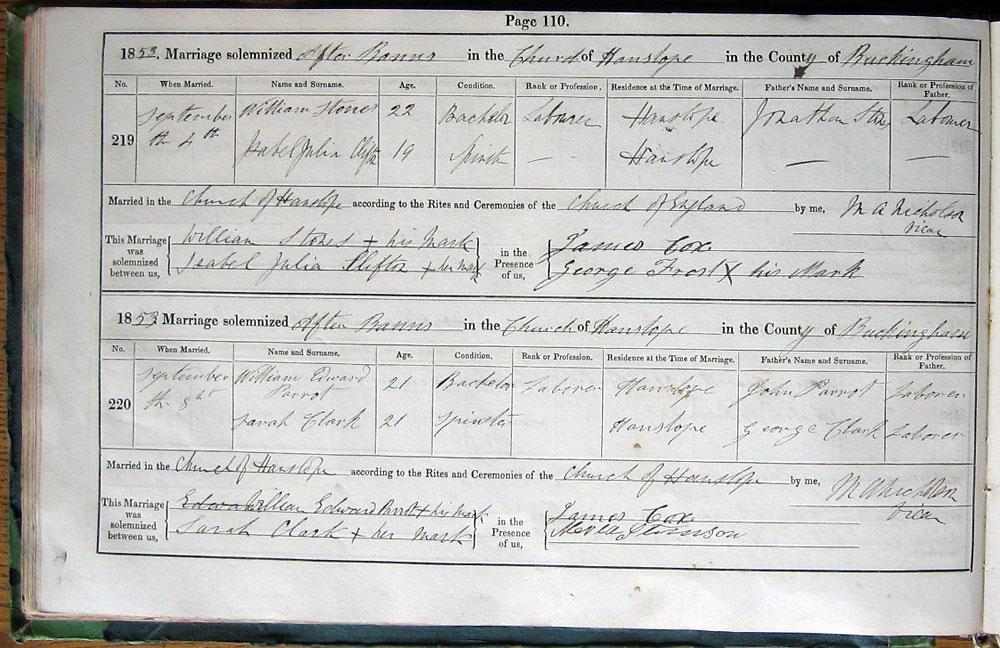 1853. Marriage solemnized by Banns in the Church of Hanslope in the County of Buckingham