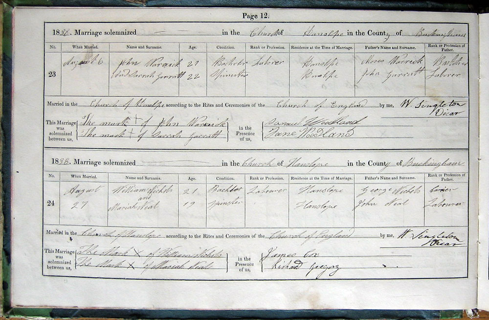 1838. Marriage solemnized ..... in the Church of Hanslope in the County of Buckingham