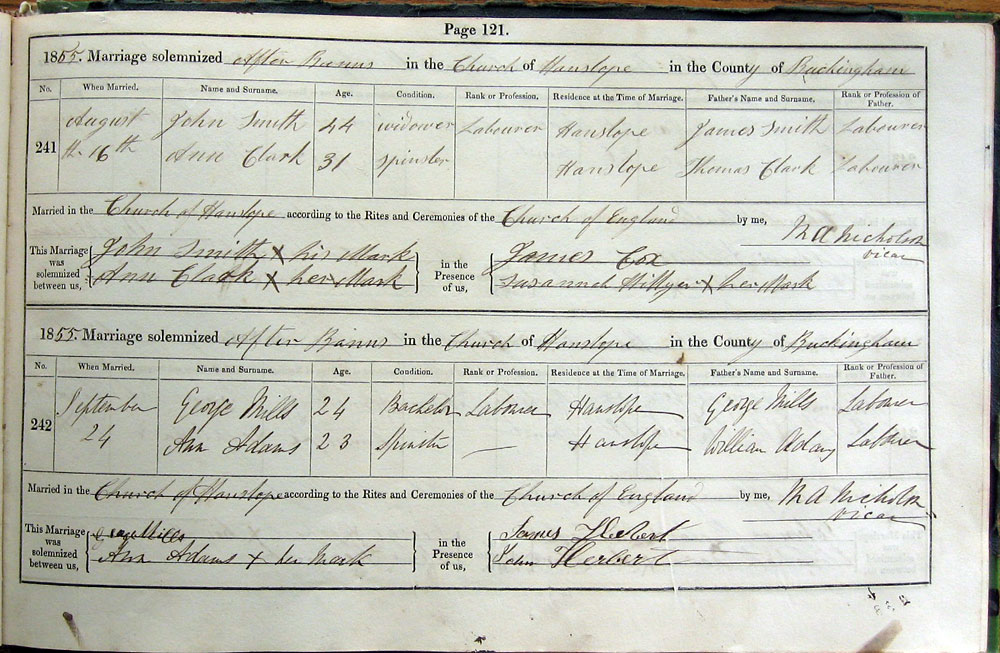 Married in Church of Hanslope according to the Rites and Ceremonies of the Church of England by me,