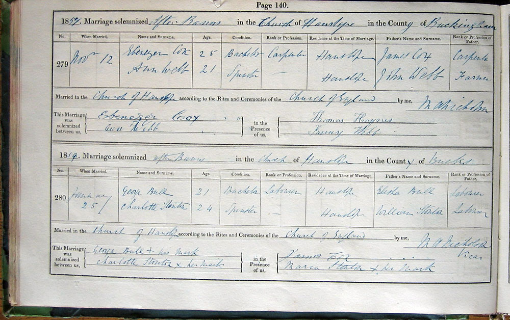 1857. Marriage solemnized by Banns in the Church of Hanslope in the County of Buckingham