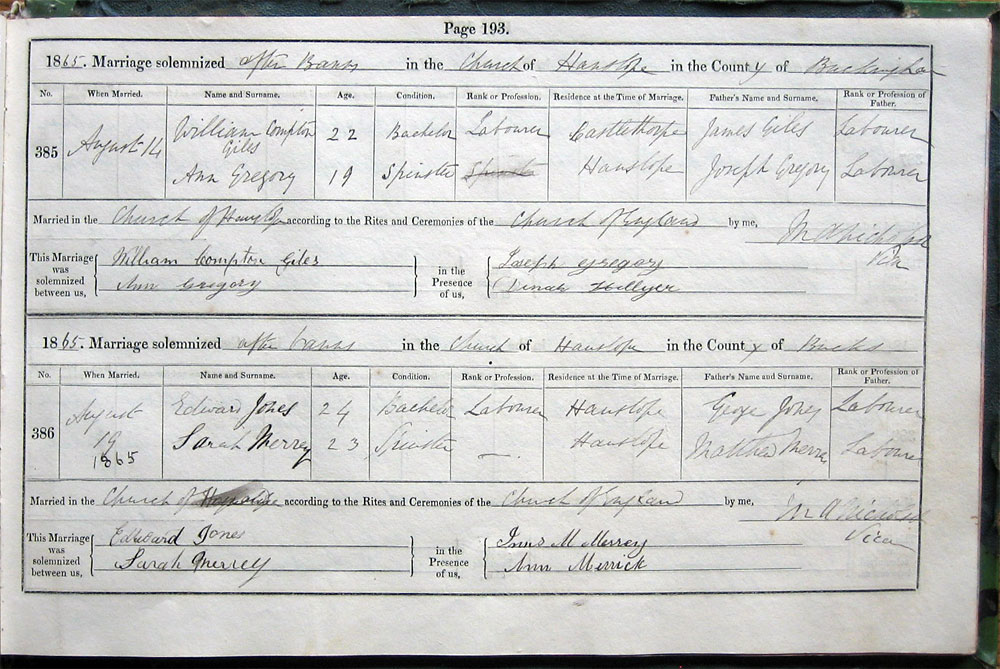 1865. Marriage solemnized by Banns in the Church of Hanslope in the County of Buckingham