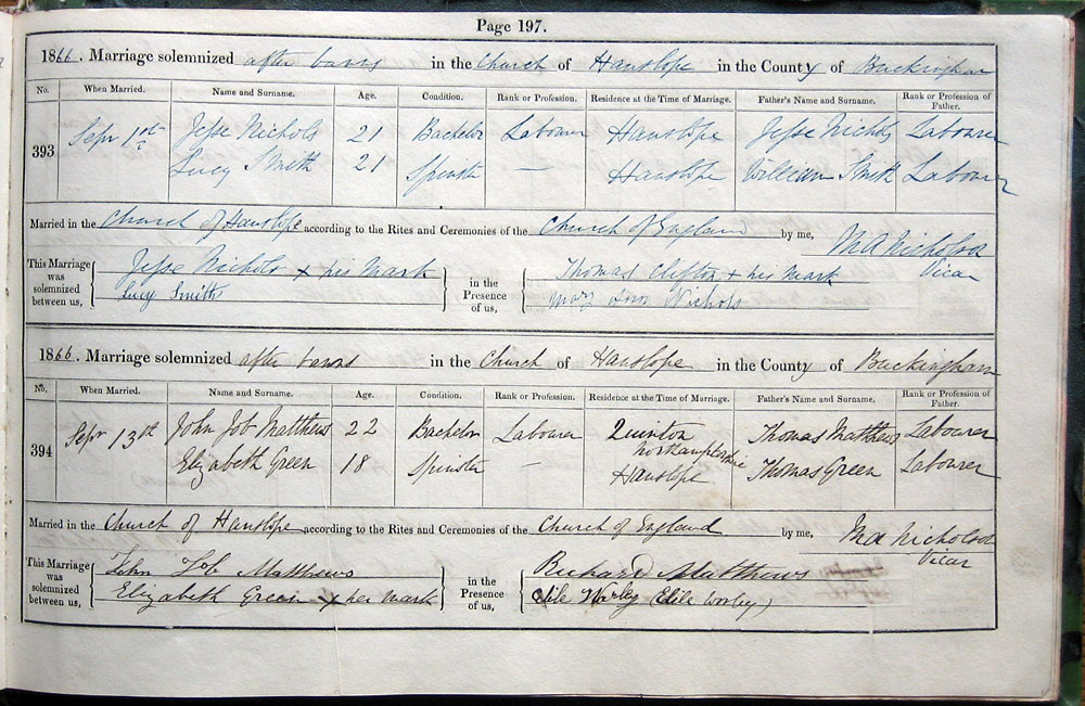 1866. Marriage solemnized by Banns in the Church of Hanslope in the County of Buckingham