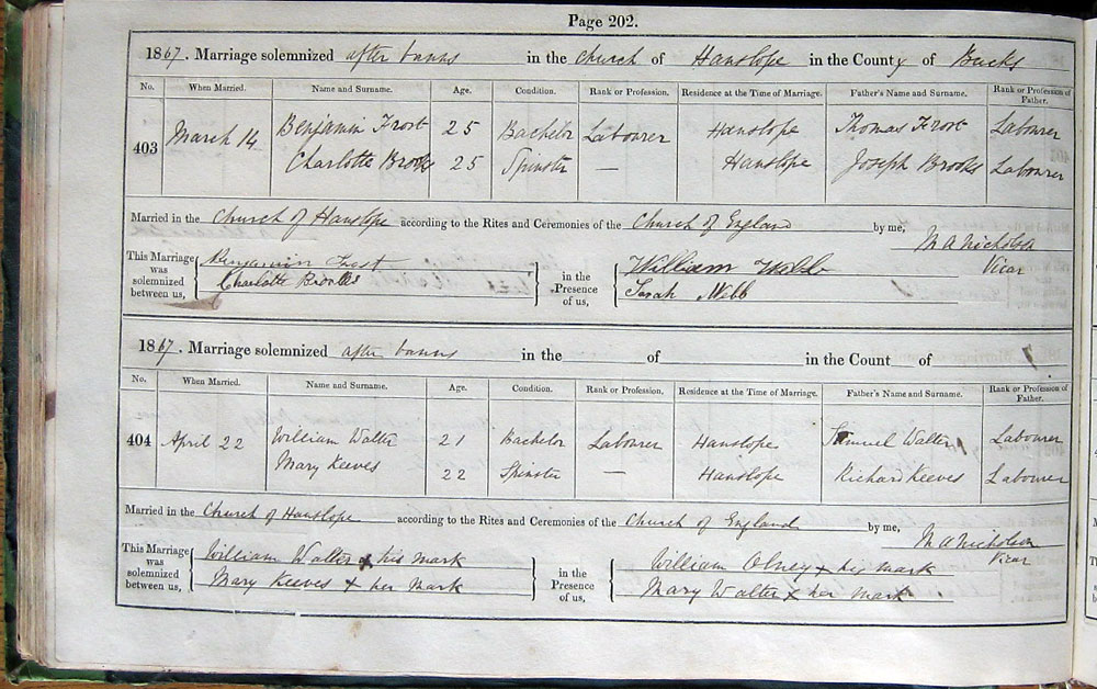 1867. Marriage solemnized by Banns in the Church of Hanslope in the County of Buckingham