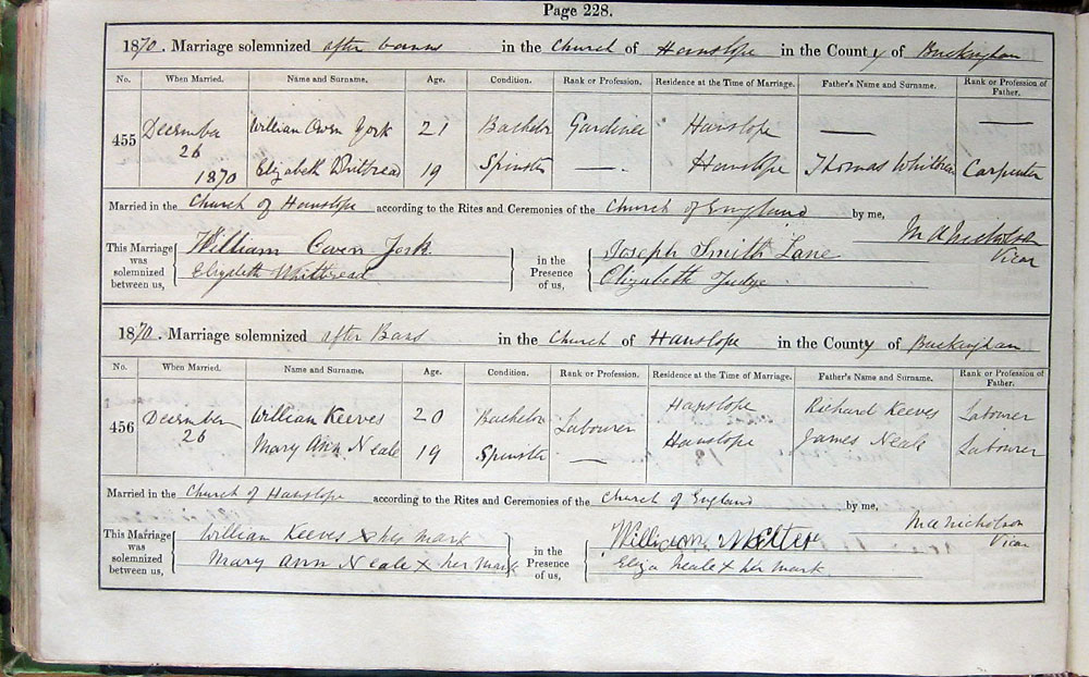 Married in Church of Hanslope according to the Rites and Ceremonies of the Church of England by me,
