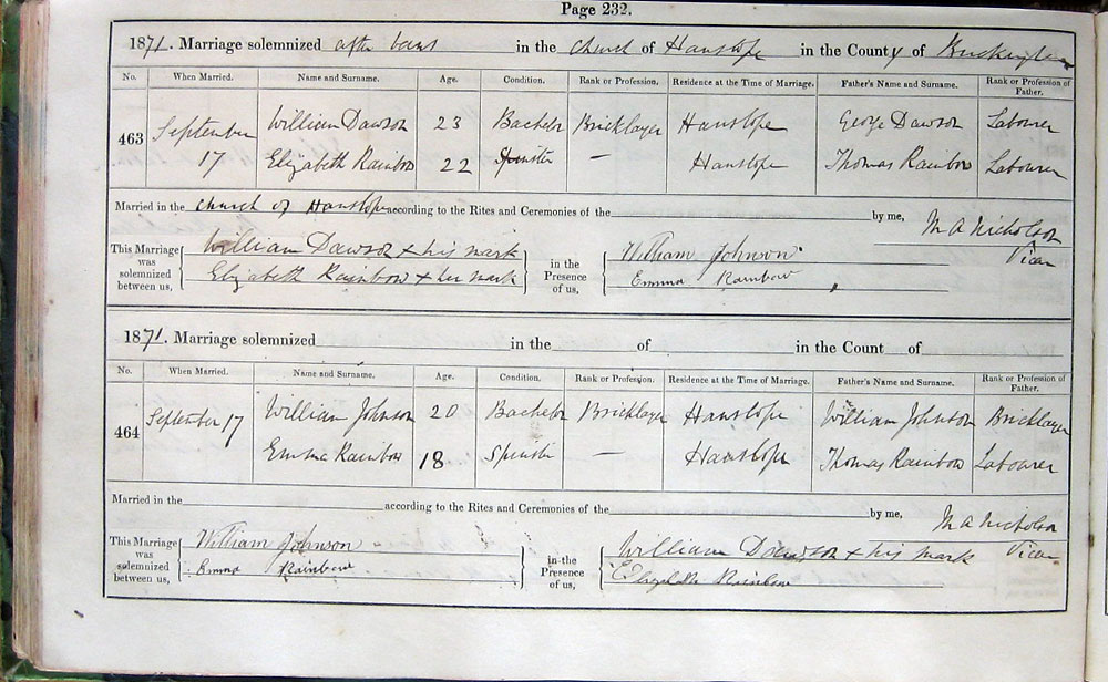 1871. Marriage solemnized ..... in the Church of Hanslope in the County of Buckingham
