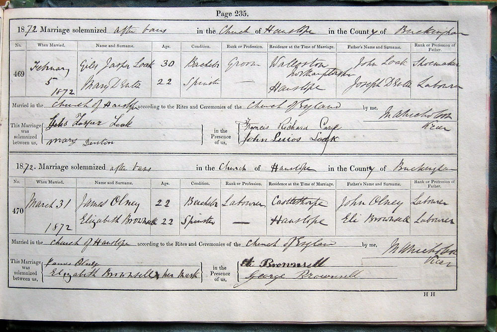 Married in Church of Hanslope according to the Rites and Ceremonies of the Church of England by me,
