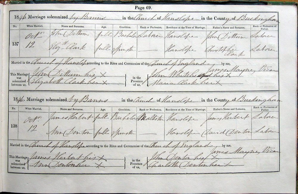 1846. Marriage solemnized ..... in the Church of Hanslope in the County of Buckingham