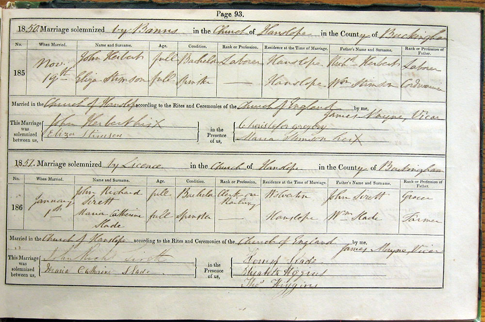 1851. Marriage solemnized by Licence in the Church of Hanslope in the County of Buckingham