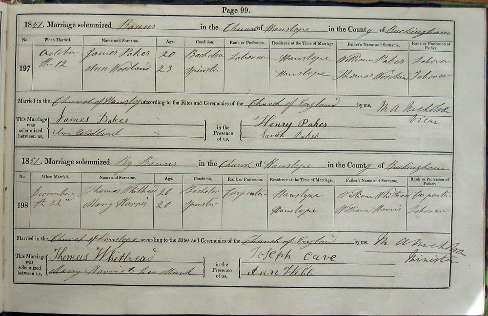Married in Church of Hanslope according to the Rites and Ceremonies of the Church of England by me,
