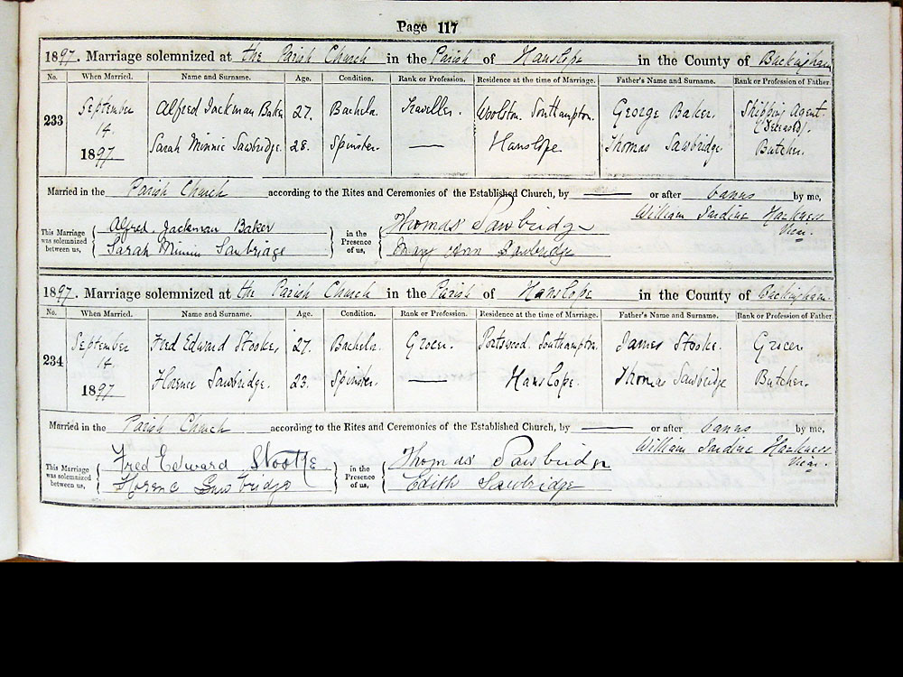 1897. Marriage solemnized the Parish Church in the Parish of Hanslope in the County of Buckingham