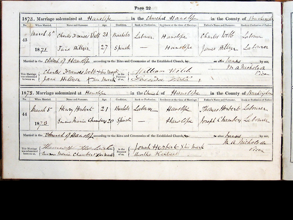 1878. Marriage solemnized the Parish Church in the Parish of Hanslope in the County of Buckingham