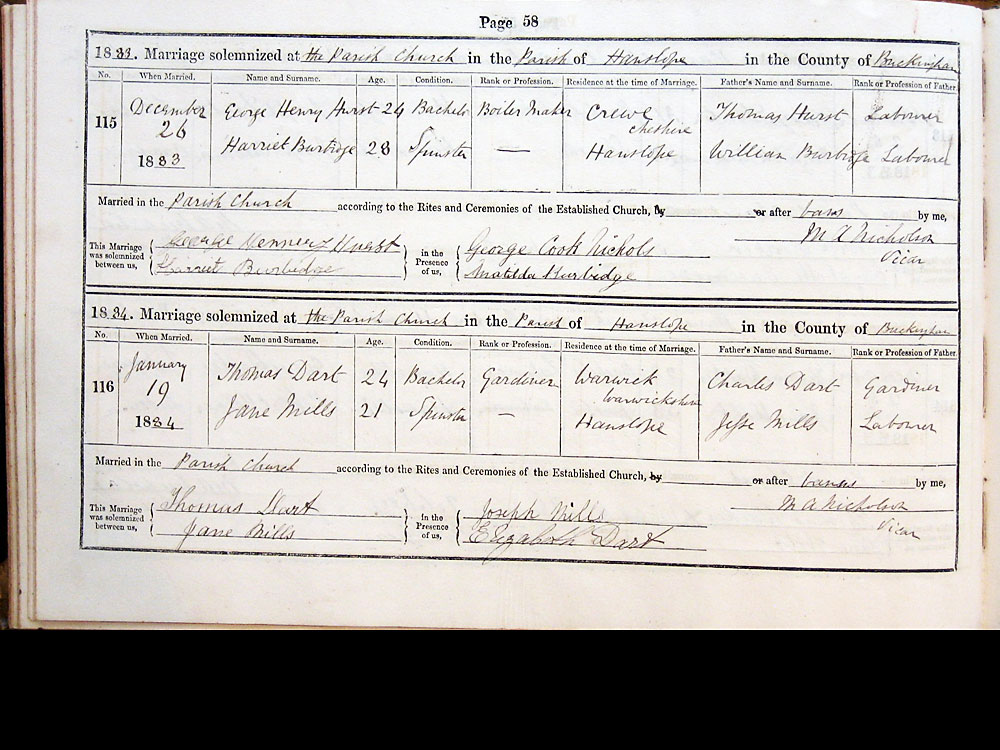 1884. Marriage solemnized the Parish Church in the Parish of Hanslope in the County of Buckingham