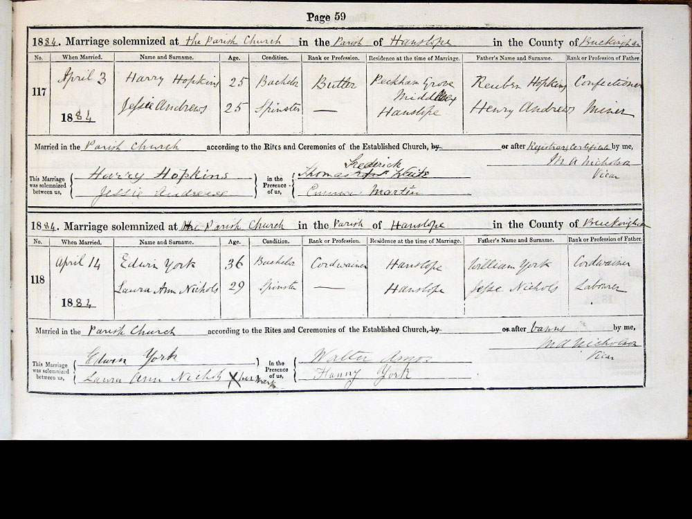 1884. Marriage solemnized the Parish Church in the Parish of Hanslope in the County of Buckingham