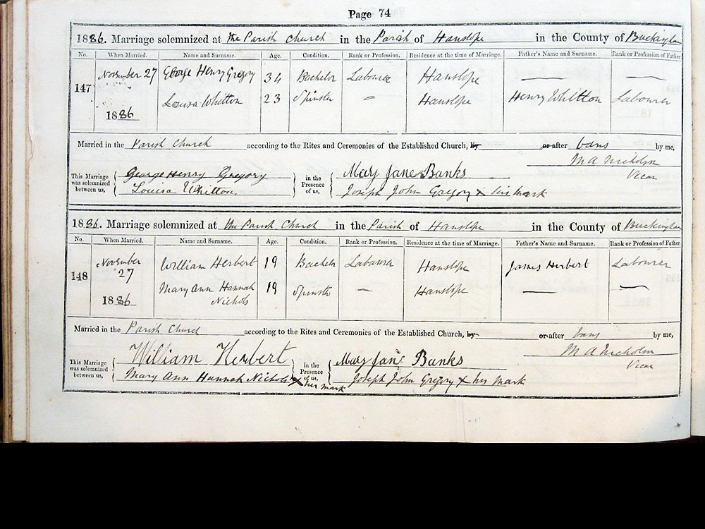 1886. Marriage solemnized the Parish Church in the Parish of Hanslope in the County of Buckingham