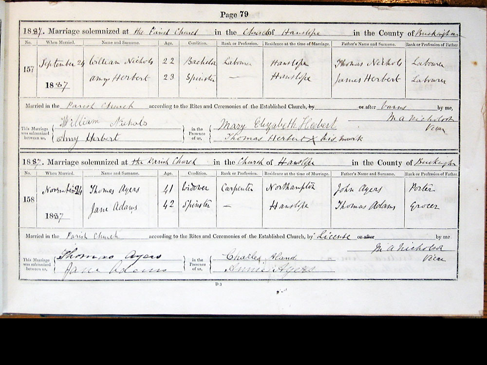 1887. Marriage solemnized the Parish Church in the Parish of Hanslope in the County of Buckingham
