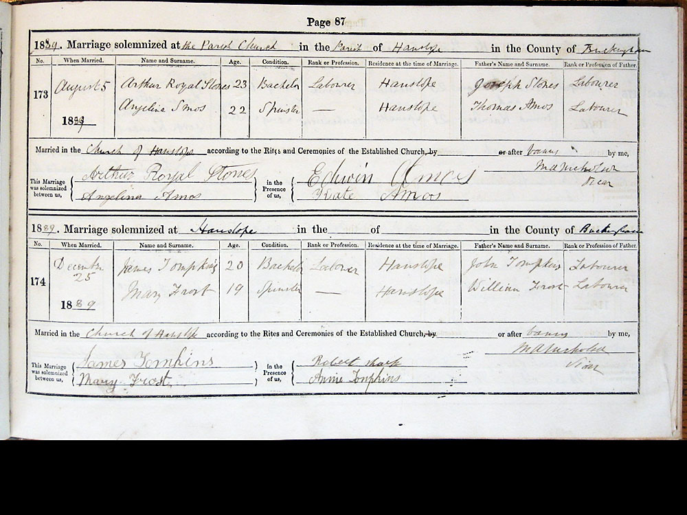 1889. Marriage solemnized the Parish Church in the Parish of Hanslope in the County of Buckingham