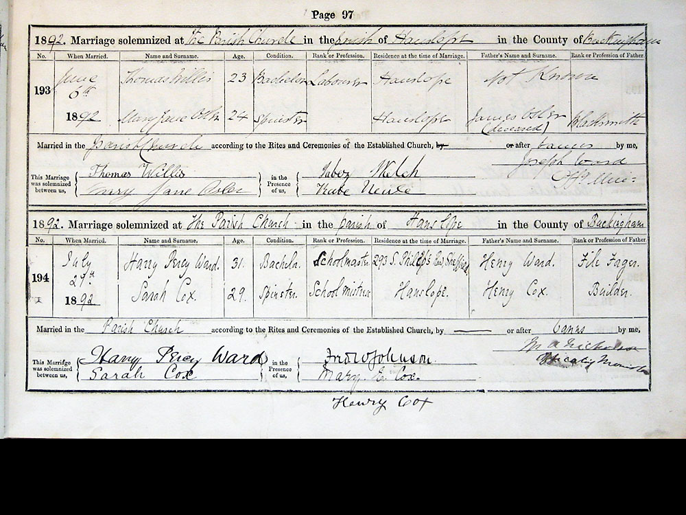 Grooms address 293 St.Phillips Road. Third witness Henry Cox